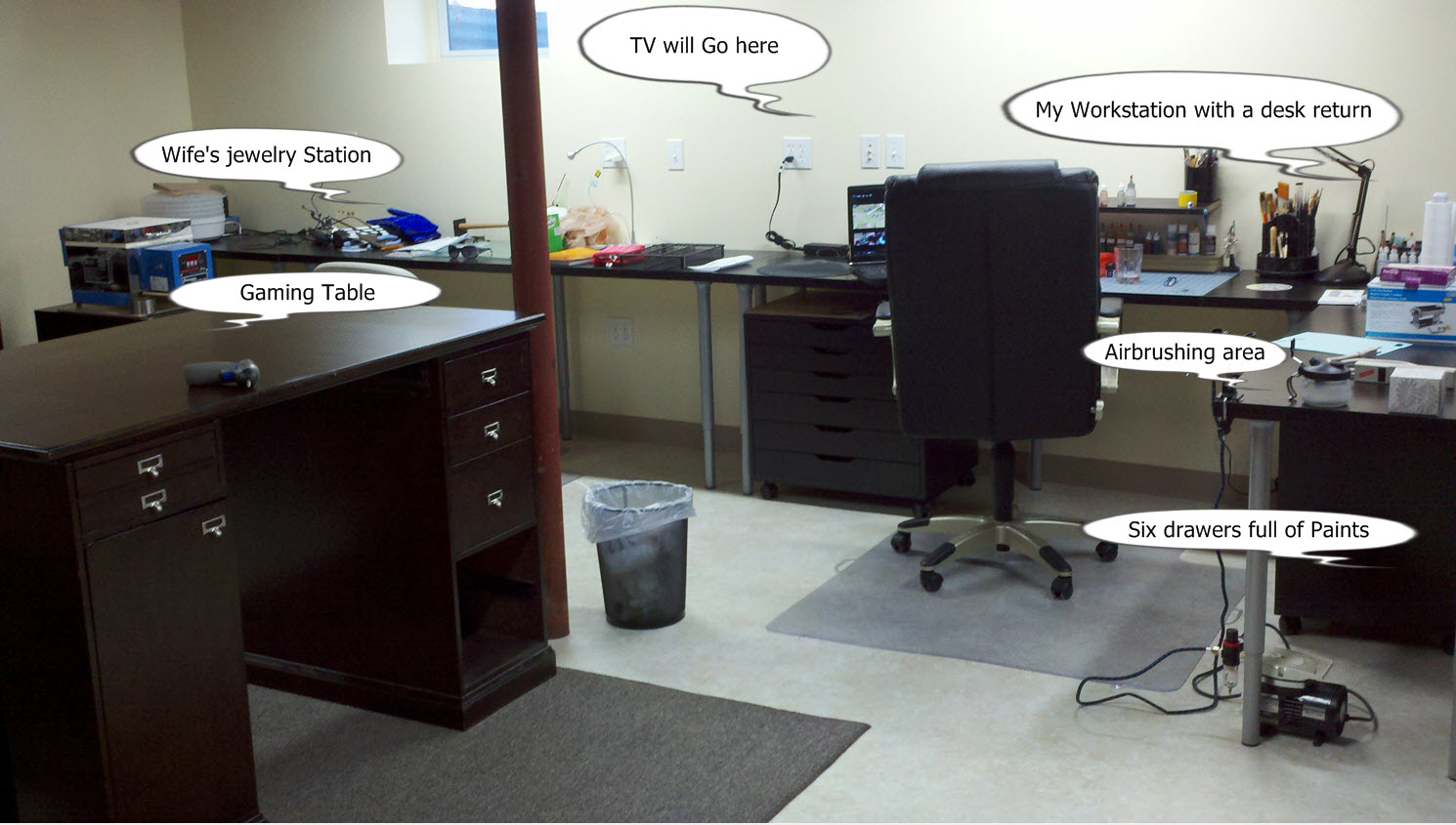 I'll bite. Here's a pic of my new studio that we just got finished in my basement. It's got tons of light thanks to daylight bulbs and plenty of space. You cant see it but there are almost 10 shelves off to the side that are almost full with model kits and bitz boxes. The gaming table was a hobby desk I got from Costco that I want to build a table top for. its already 5x3.5 so its almost the right size and has tons of storage as well. All I have to do is to install a spray booth for my airbrush and vent it out of the house.