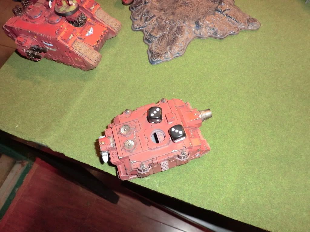 His Turn 1. Not much moves and he tries to inflict as much damage as possible before I hit him. 1 Vindicator fluffs and I make my cover saves against the other. His Landraider and