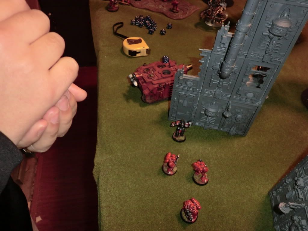 So 1 is stunned and immobilized, the other 2 weapon destroyed (he added a strombolter). In other news I torrent the Sanguinor with torrent of fire and manage to kill him. Doom Scythes do very little this turn with me aiming at his Devastators and him making all cover saves. Tesla destructors elsewhere manage to put 2 wounds on Mephiston and knock out a couple of