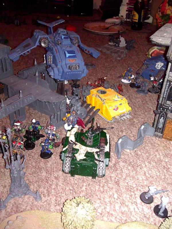 The balance of the battle had shifted violently and it was not the way that would favour Kalthar immediately. Though it was definitely not bad for Kalthar either. The Orks were hurling themselves mindlessly at the enemy and the Tau were falling back and succumbing to anything that came within 100 yards. The wolves however were stubborn, the wolves were fighting back and the wolves were winning. But this didn't matter to the Fallen Lord, he would simply hurl the forth most units at his enemies and withdraw with what is most valuable to him. His Land Raider jolted sharply and the lights went out quickly replaced by a soft red glow, things had just got a little more interesting..........'