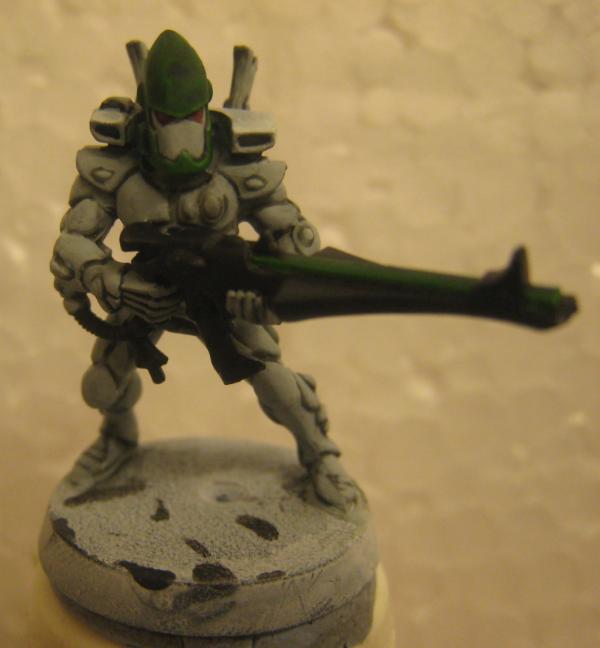The helmet is snot green painted directly over white. I was thinking about putting Dark Angel green on first, but didn't bother in the end. I'm glad I didn't because I think that the green is a good darkness with just snot + wash and I'm hoping it'll come out nicely after I layer the snot green back up.