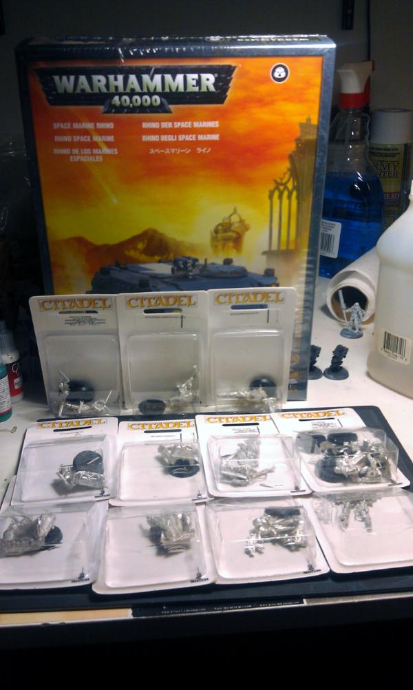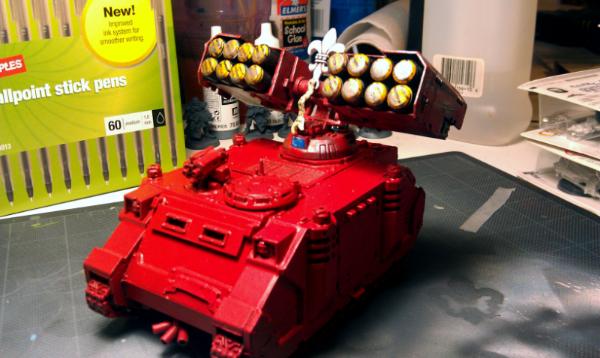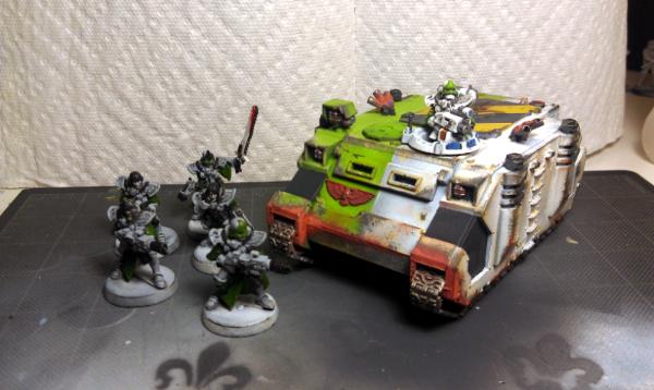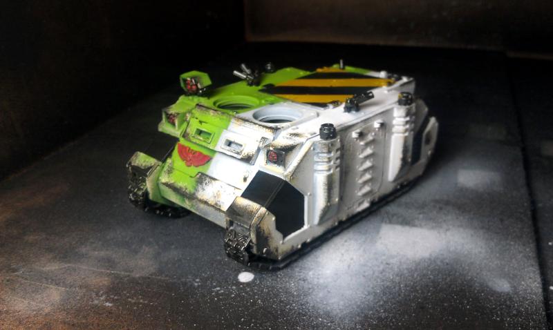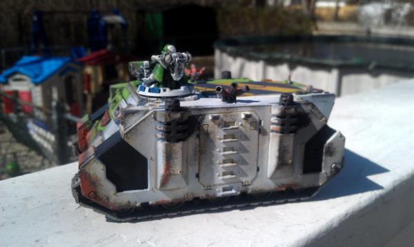 First off, here is the (almost) finished Rhino. I didn't have an extra Rhino Stormbolter around so she had to do.