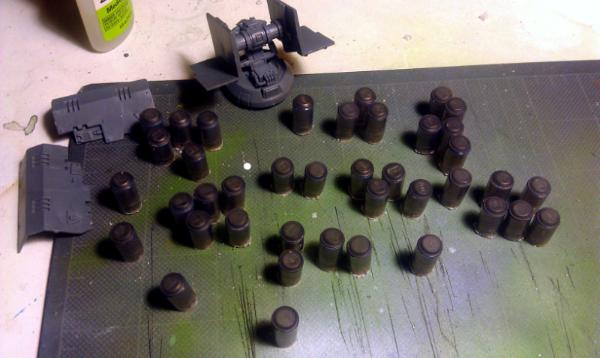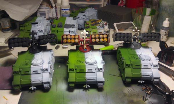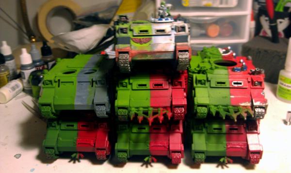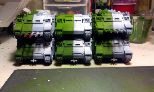 70% of the tanks are basecoated, the other 3 Rhinos are in need of some scrubbing.