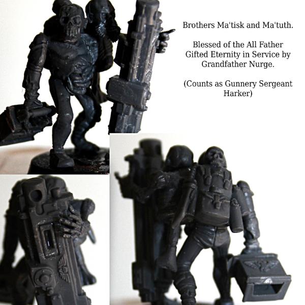 Prior to the PDF's fall into corruption Ma'tisk and Ma'tuth were brothers by blood and in arms, however as the war of attrition war on the casualties began to pile in, Ma'tuth was struck by a stray blast from enemy fire and rendered unable to fight. When the company made its deal with nurgle to secure victory Ma'tisk sought his own deal to bring his brother back to the fight, bearing his soul to the all father he begged to have his brother by his side in the battle once more, that the two be restored to the fighting prowess they had shared together. Grand Father nurgle is not without a heart, fusing the disease ridden torso of Ma'tuth to his brother and leaving the wounds behind the pair could continue their war in his name.