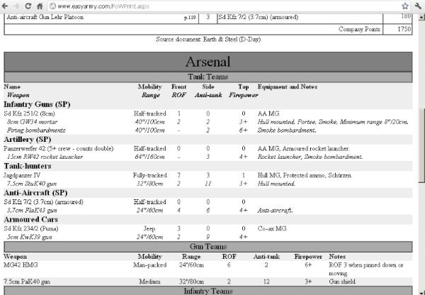 Easy Army does all that for you, if you go on their website subscribe to the books you want (like $2 a book or whatever) and you can then build an army print it and you get a nice list of everything and all the stats like an Army crib. Looks like this, you can play around with the output file and make it bigger or smaller, but if you are clever you end up with a nice little crib just for your force. It's better than taking a whole book to a game. I remember that Armybuilder has a completely customisable output too, but their FOW setup is awful compared to Easy Army.