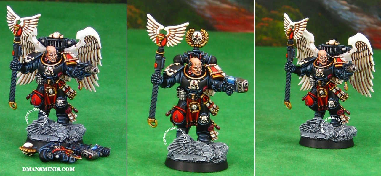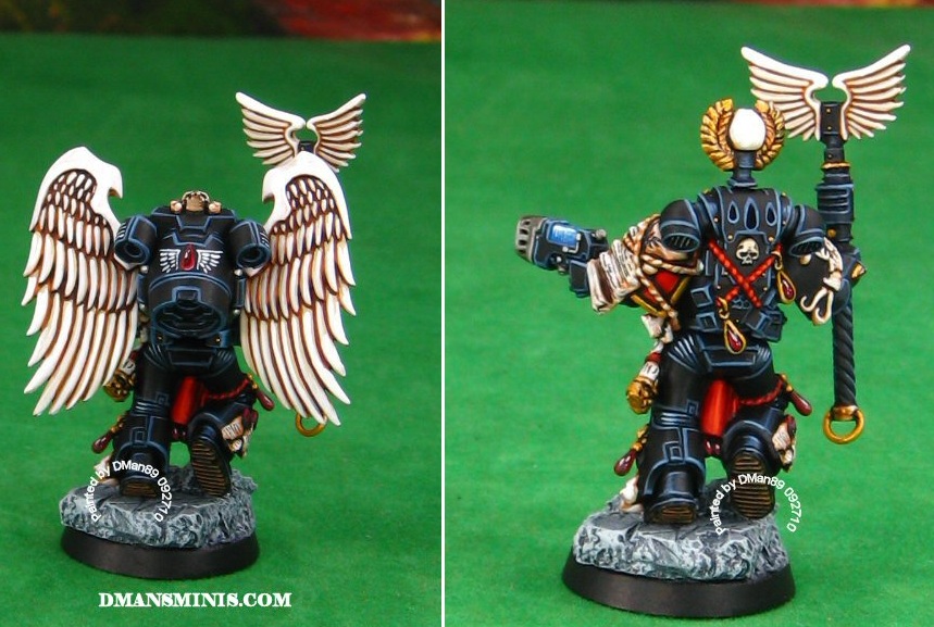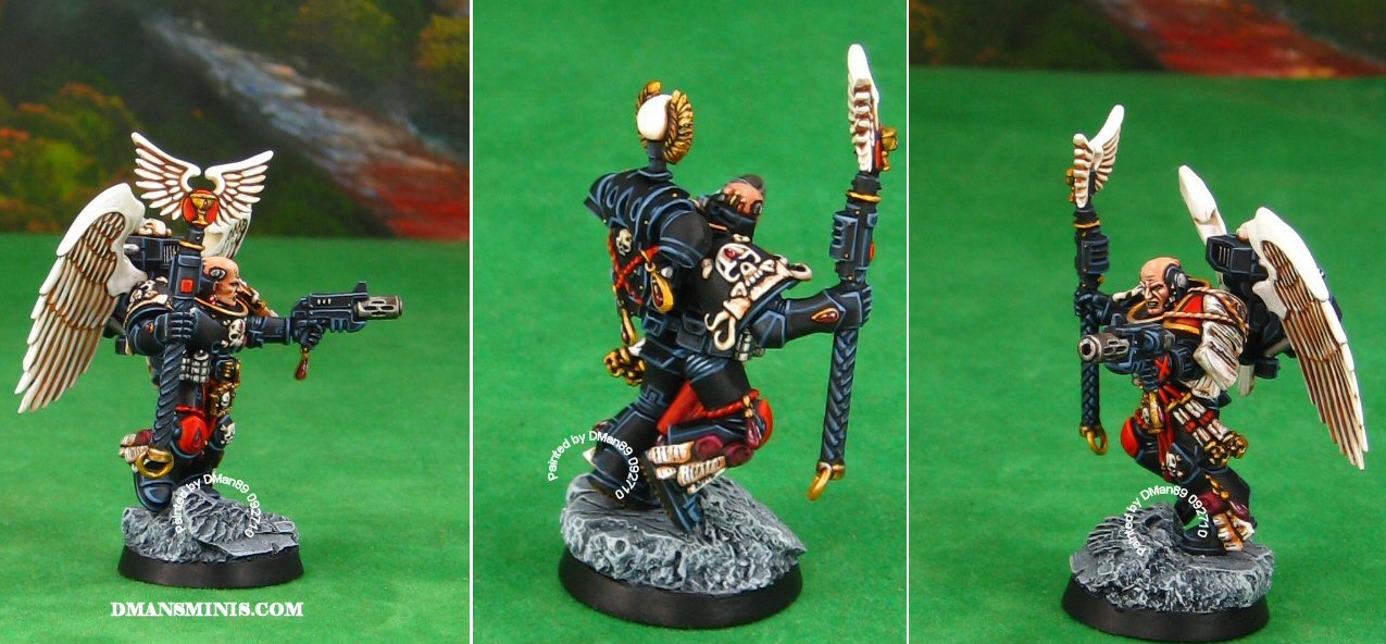 A converted and magnetized Blood Angel Chaplain. I magnetized the pistols on his left arm to be interchangeable with the Bolt pistol, Plasma pistol, and Infernus pistol. The backpacks are magentized to be interchangeable with the standard powerpack and a winged jumpack.