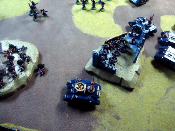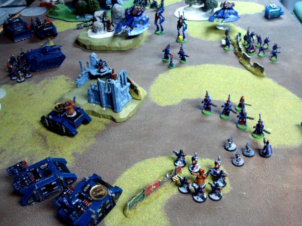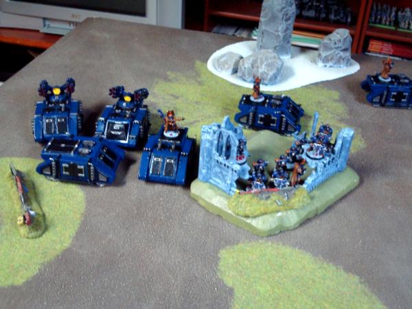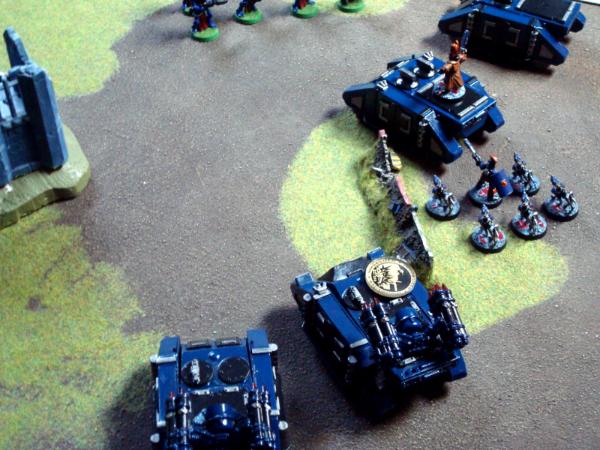 In the center of the board the Wraithseer shakes the rhino full of Arbites near the Retributors.