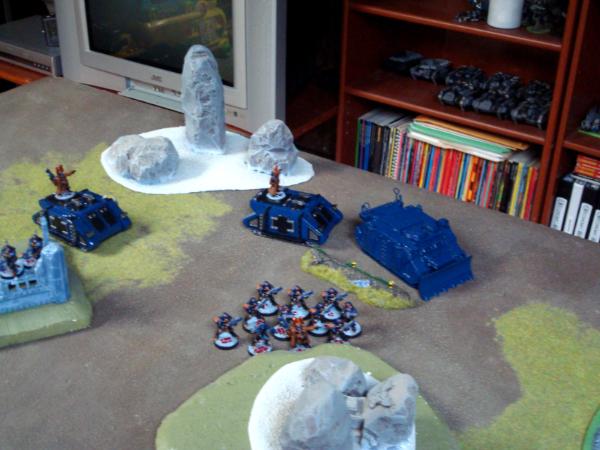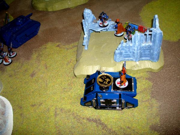 Patrol team with a priest takes up position behind rocks to spring into cover, the empty Repressor and a loaded Rhino back them up.