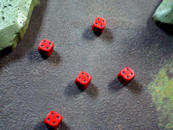 The Inquisitors squads is packing 3 warriors with plasma guns, a priest with a master crafted plasma gun and the Inquisitors own master crafted plasma pistol for a total of 9 shots. Total they score 6 hits and NO WOUNDS