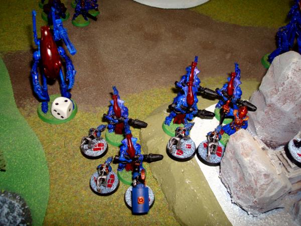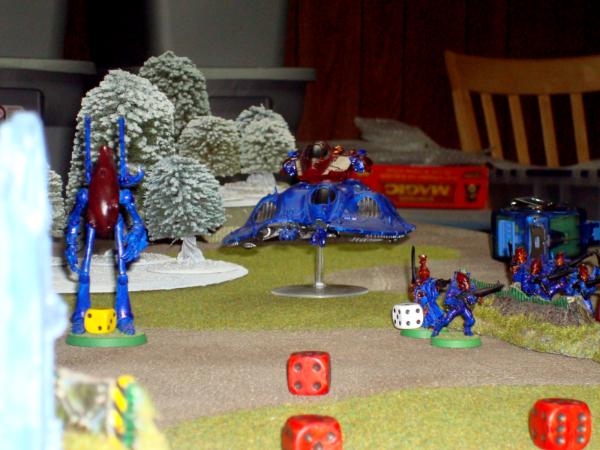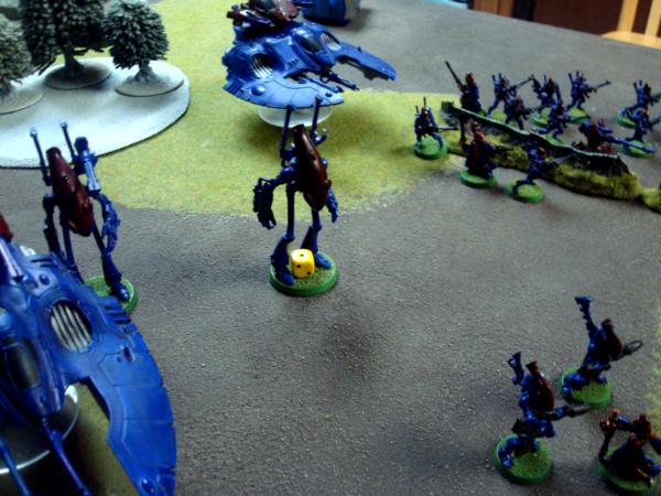 The Farseer along with his Guardians withdraw to avoid the cyber mastiffs on their heels. The wave serpent and fire prism pull to safer positions.