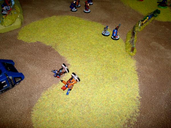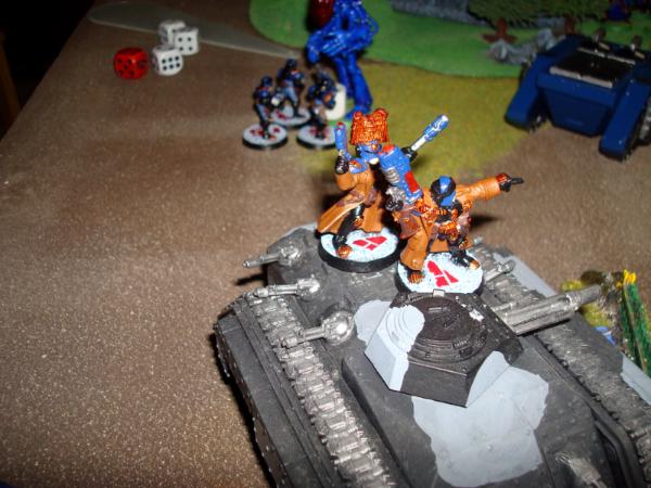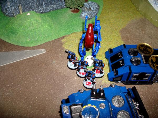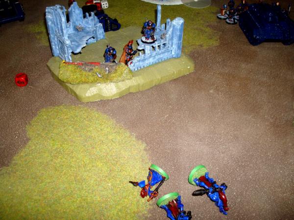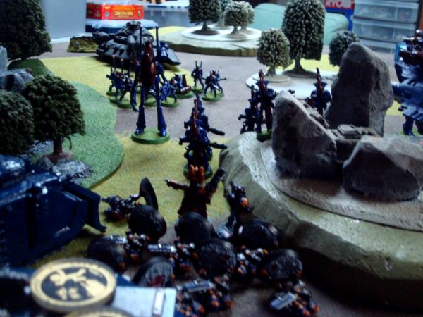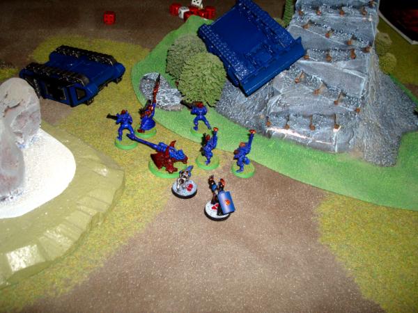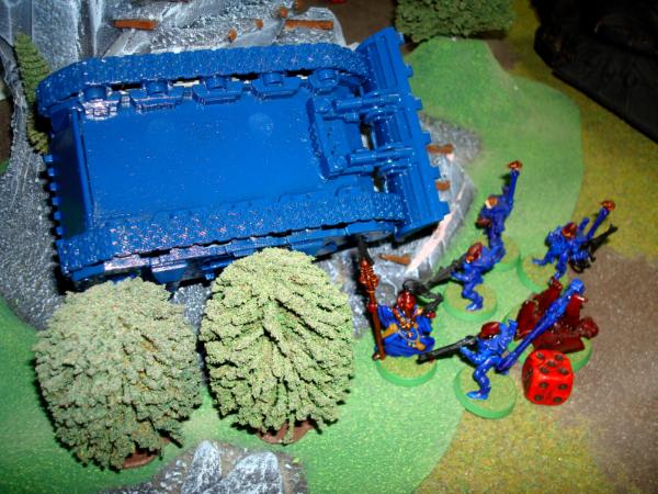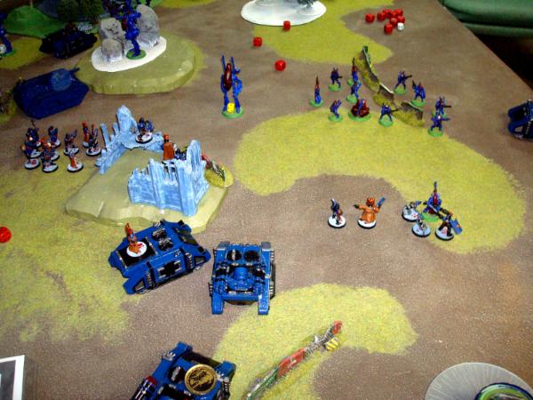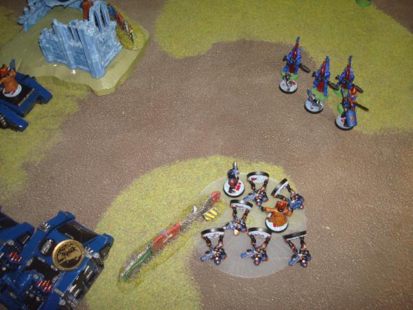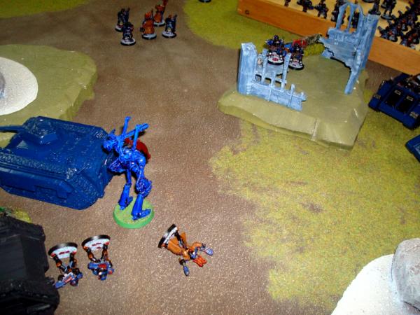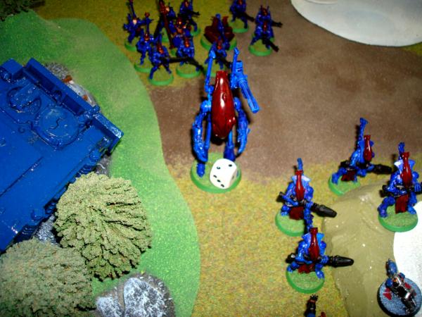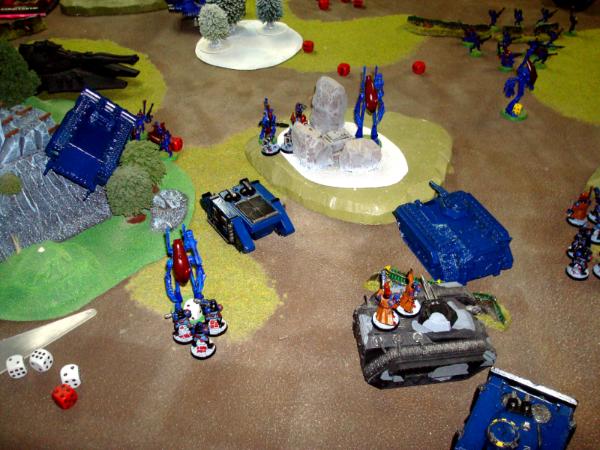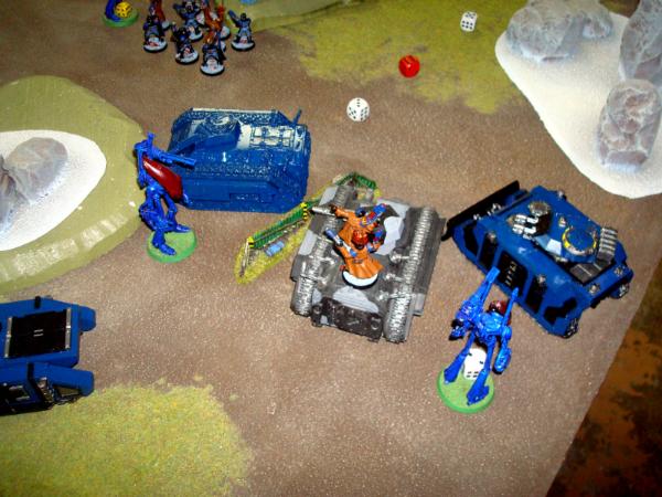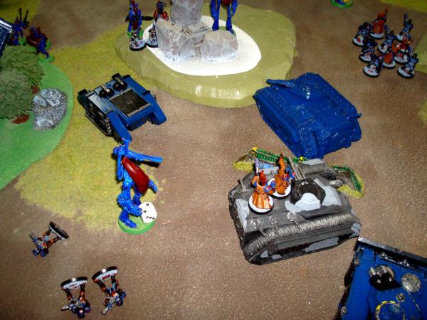 The Guardians on the Eldar right assault the repressor. The Warlock scores a pen and wrecks the repressor with his singing spear.