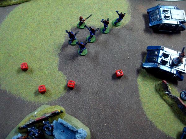 In a surprising display the Fire Prism shoots across the board at the Arbites stranded from the rhino blast. The shot only scatters 1” killing 6 and in defiance they pass their