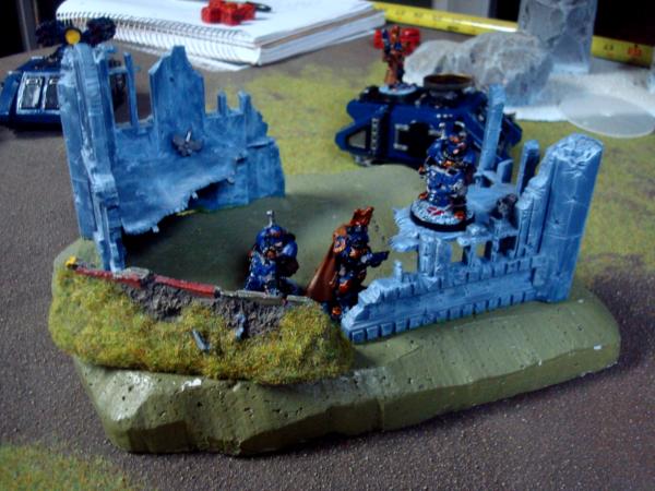 Retributors take up position in the ruins, Exorcists and Rhinos take cover behind them.