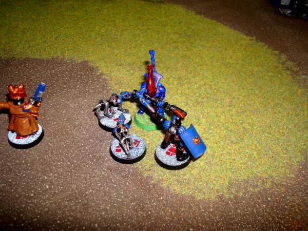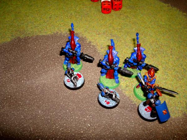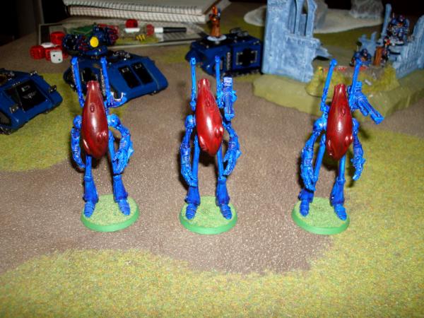 The cyber mastiffs assault the guardians. The Warlock kills one puppy, the Eldar take the only wound on the warlock and fail. Drawn combat.
