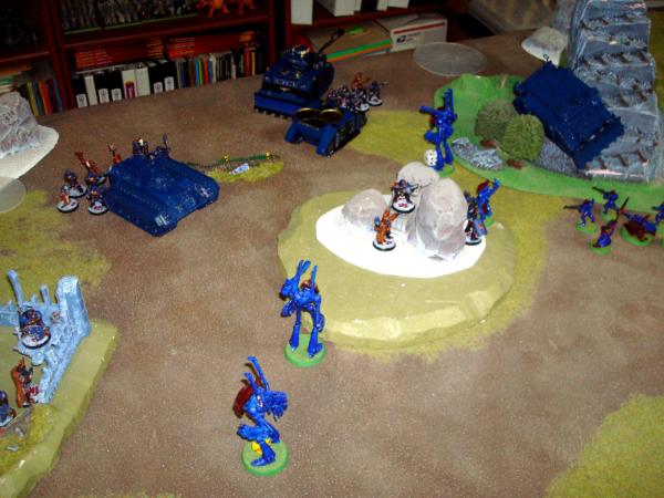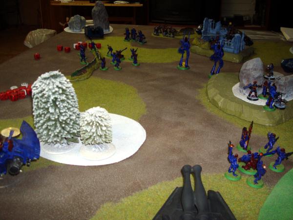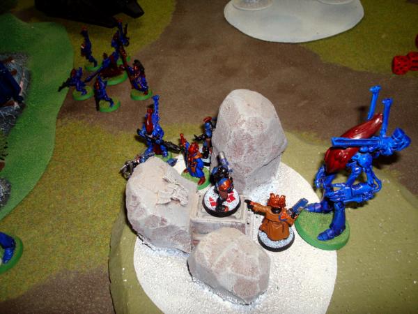 Ld test. He also puts guide on to the guardians he is with. Combined fire from the Wraith guard on the Eldar Right flank, the small squad in the center, and both Wraithlords kill off the rest of the Arbites in the rocks and the priest attached to them. First kill point to the Eldar.