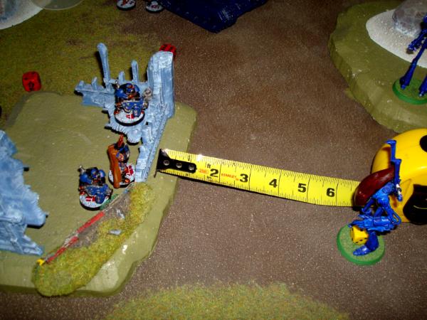 After that there is a lot of whiffing on the Eldar side for shooting. The Wraithseer tries to assault the retributors and is short by an half an inch.