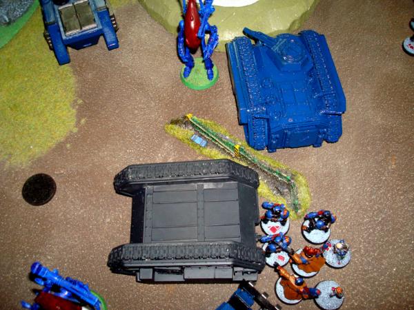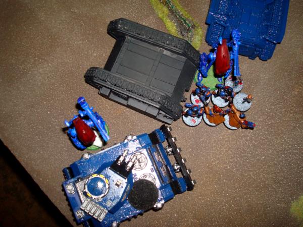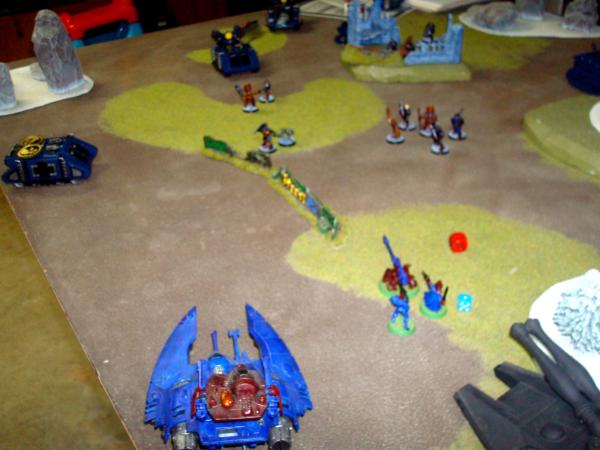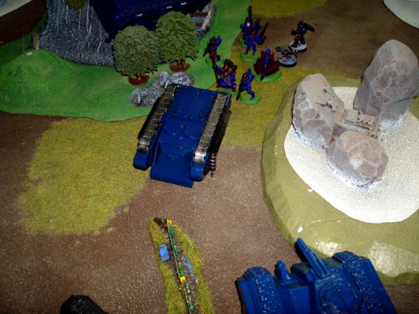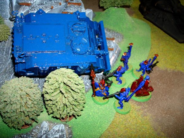 The wave serpent immobilizes and blasts a storm bolter off of a rhino trying to encircle the Farseer.