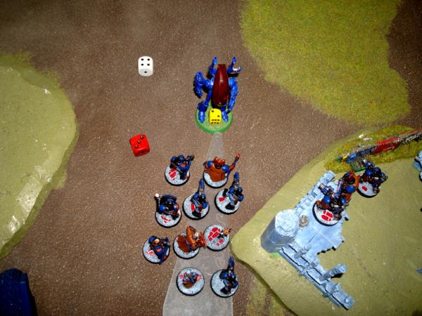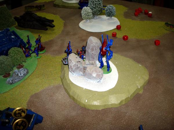 The Eldar advance on all fronts. The Wraithseer takes a wound from perils of the warp attempting to cast foreboding.