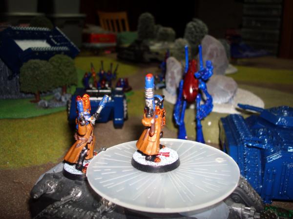 Much to the Eldar’s frustration the Inquisitor Lord’s psychic hood stops all 3 powers attempted by the Farseer and Wraithseer. Steam is starting to come out of my friends pointy ears, he really hates that thing.