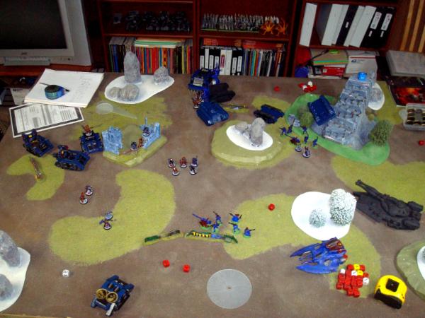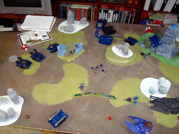 The scenario stipulates that at the end of turn 5 the game continues on a 3+. The roll is a 2, the game ends. ELDAR WIN