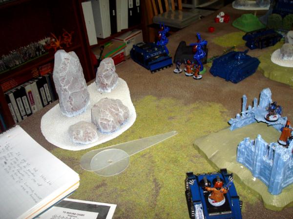 Ld test. The immolator takes another wound off of the Wraithseer. Being out of range for shooting the Inquisitor Lord and his squad run for 5” towards the Wraithseer.