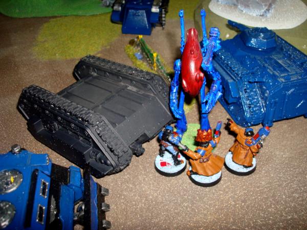 The Wraithlord in combat with the Dominions kills another member, they break and are caught in his sweeping advance, he massacres for 2” towards the Inquisitors Chimera.