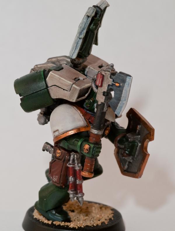 The problem has occoured whereby I can't work out how to differentiate him as a seargent. I was initially going to paint him entirely in DW colours like a DW terminator, just with regular power armour and a jump pack, but I feel that's a bit silly. Then I figured do the shoulders and the helm like DW colours, however that's not really aesthetically pleasing, it's a line of bleached bone across a figure that's mostly gonna be DA green. The greaves don't have kneepads so painting one of them white and the corresponding shoulder white is not exactly feasible either. Really hit painters block on this one!