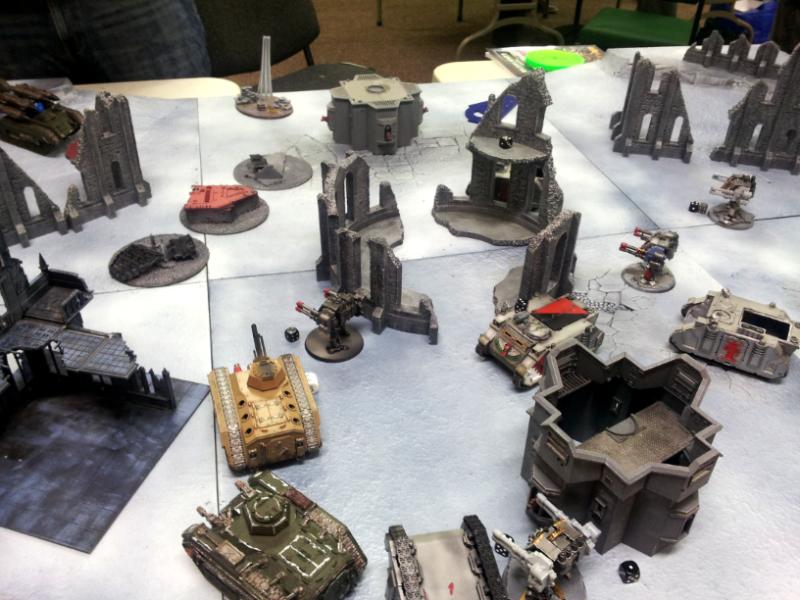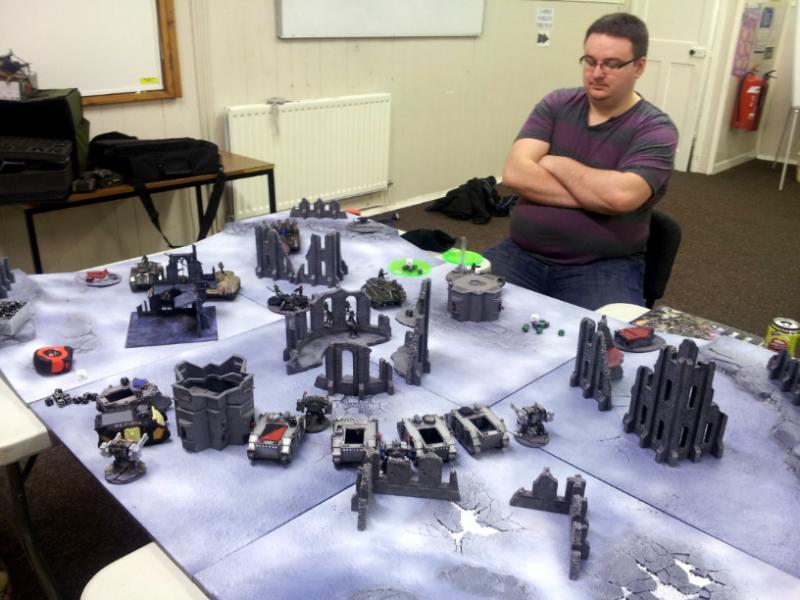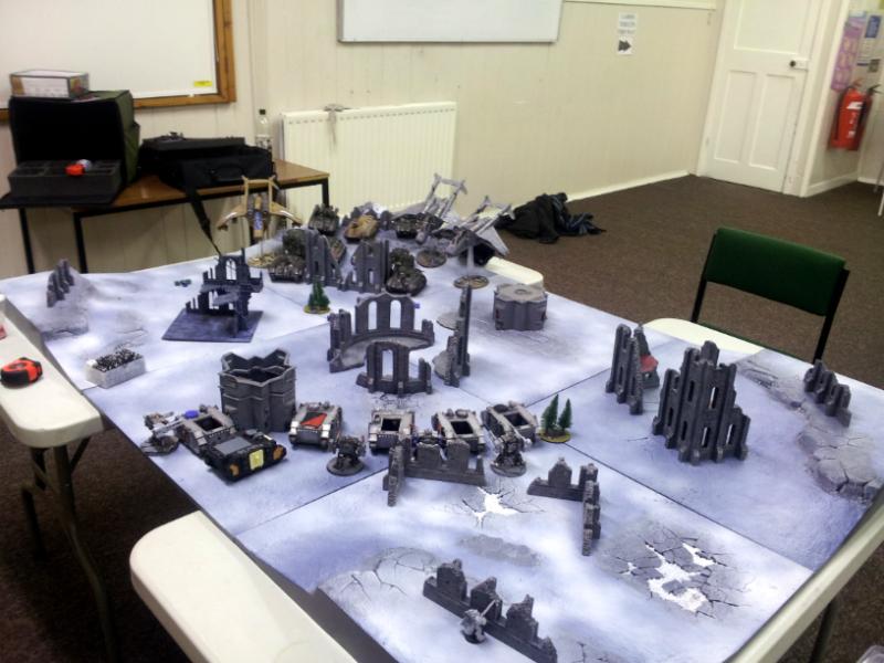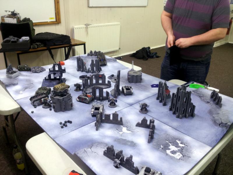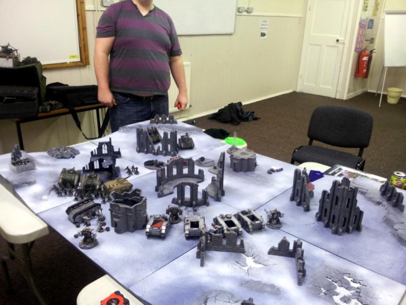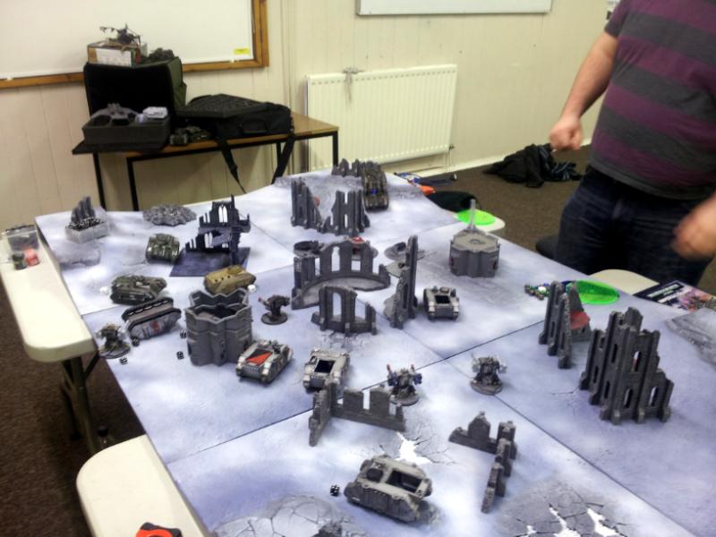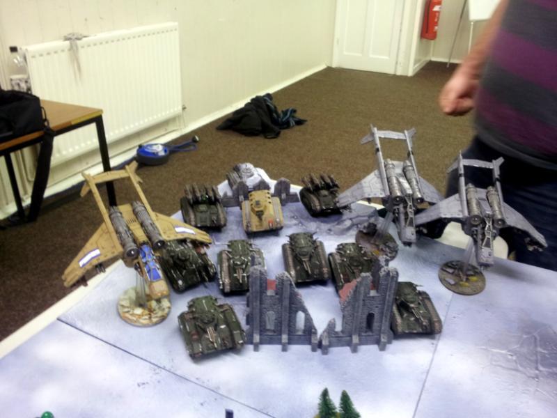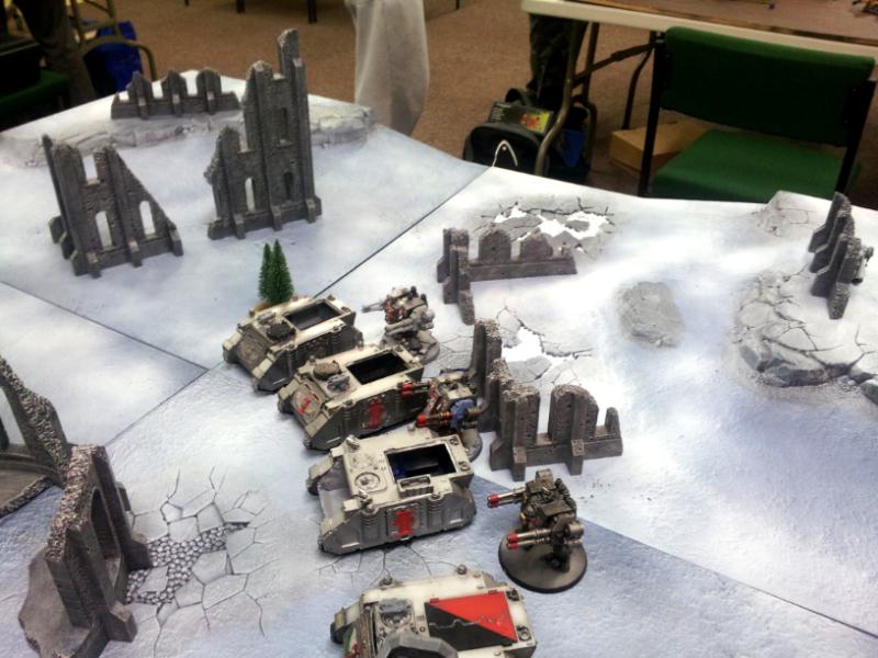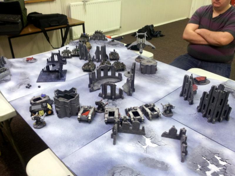 LOS on. Perhaps if he placed all Chimeras together on one side of a ruin and then the Manticores inside the ruin itself they would have got cover. His other mistake was hanging the plasma tanks back and rolling the three melta tanks forward with only themselves to support each other, this combined with the Vendetta scout move feed the Guard piecemeal to me and I picked off units each turn.