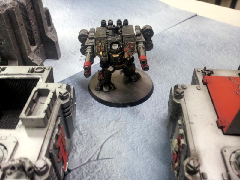 So, I deploy bottom right corner and spread my tanks and Dreadnoughts out around the 12" radius. I use a bastion to get some