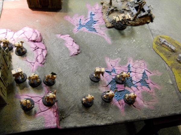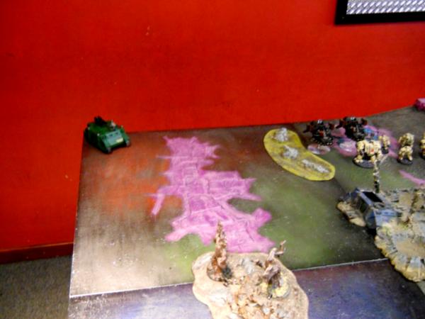He moves his regular dread away from the command squad and disembarks the purifers from the immobile razorback and moves them towards the command squad to double team the deepstrikers. ( Pic taken before he moved them) Everything else stays still apart from the far right purifers who no longer have a ride. They move up towards the middle.