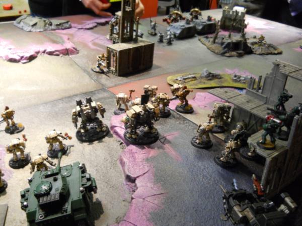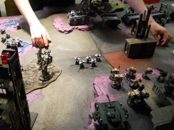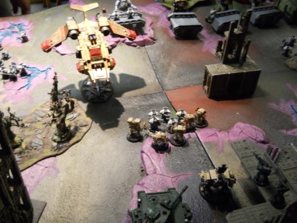 MM PoTMS shot from the storm raven. He then fires the remaining two dreads, the two purifers sitting on the wrecked razorback,the single purifer (with a psycannon) AND the untouched purifers at my termie squad in the middle. I end up losing 4 leaving the claws all alone.