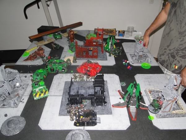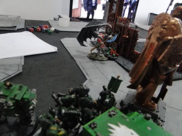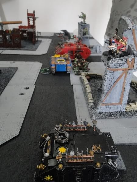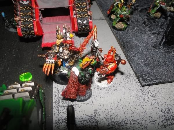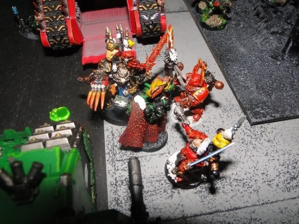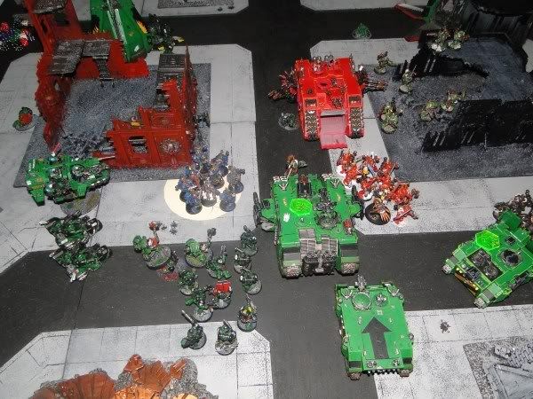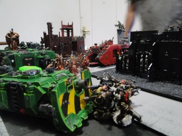 The center become a glorious mess. A wrecked Sallie raider, 1Ksons exploded by their own oblit friends, disembarkers zerkers and Abaddon trying to find a route to charge!