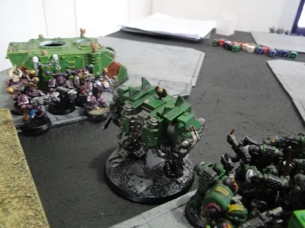 Vindicator engages the black legionaires. Drop pod gearing a Dread on the right side arrives at my home objective.