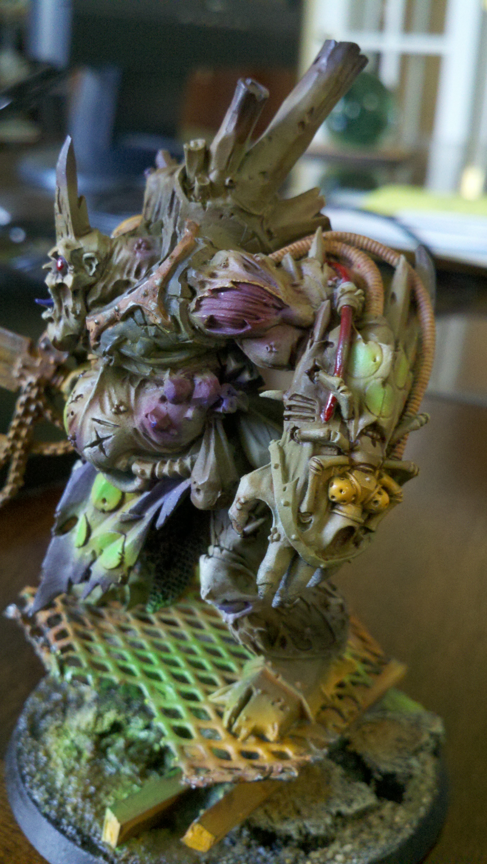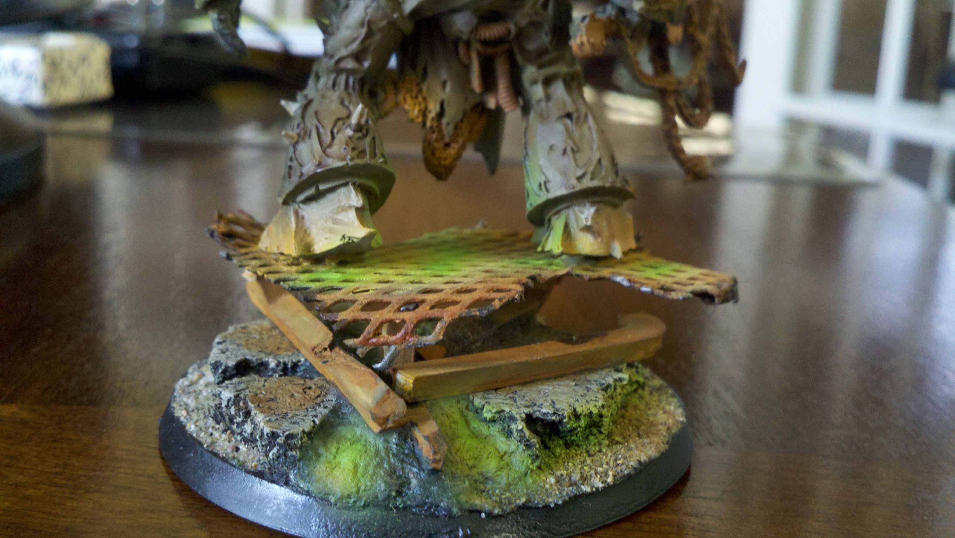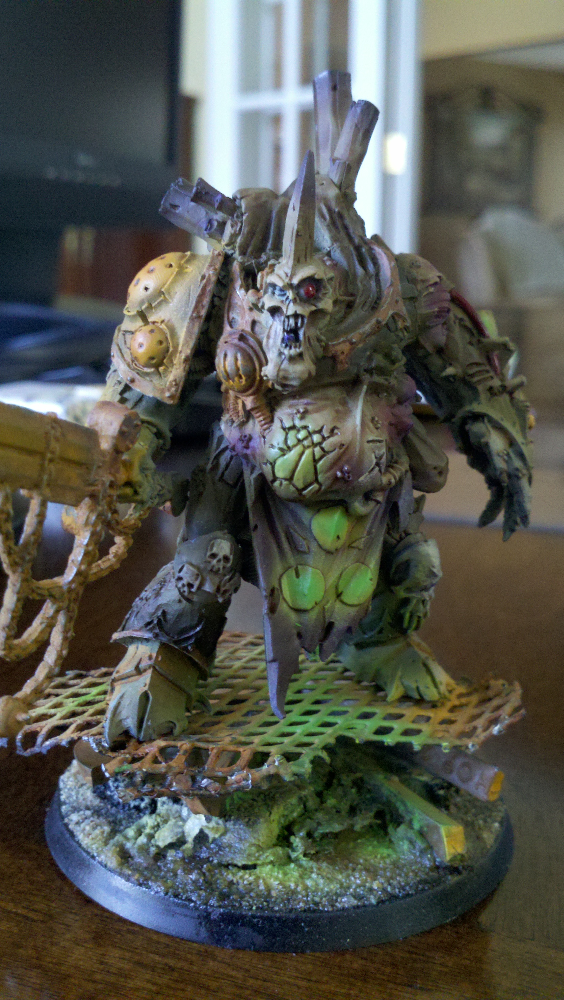 I love the base. Great idea. The only issue i have, and it can be just the light shinning on it, Is that the entire model looks like its close to being the same color. The pale green seems like its blending all the colors together. Kinda hard to see detail. Like i said that could be the light. But over all good job. Looks like what nurgle wanted it to look like.