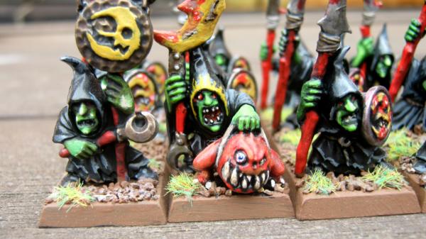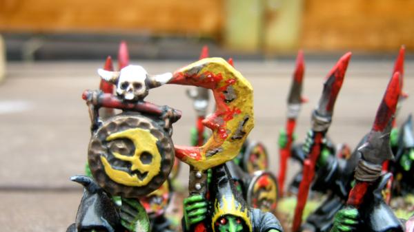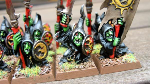 So I am new to Warhamer fantasy. I picked up the Skull-pass set ages ago but never really used it. It has only just recently seen some paint. I decided that I was going to collect orcs and goblins, so I cracked out the paints and started painting up a few of the spear-men. Here are the results so-far:
