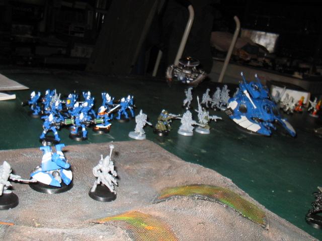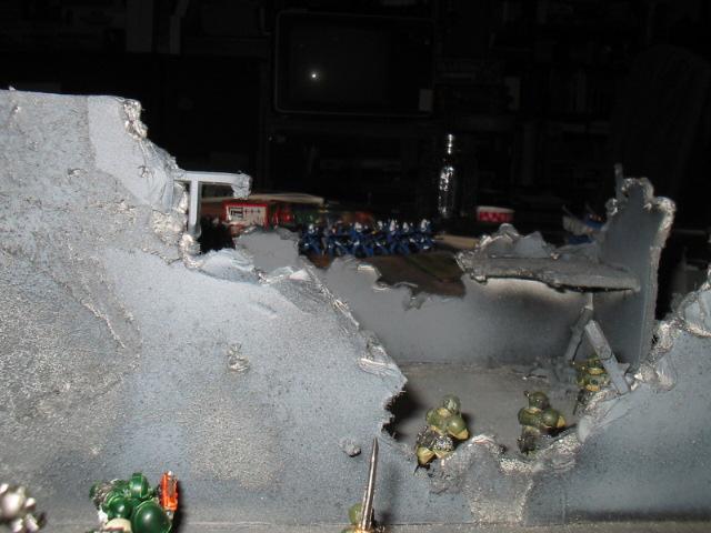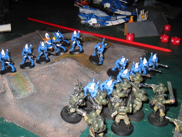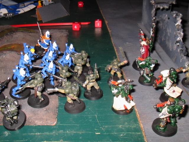 Iboshi2) got together for a battle. The details of this fight are long, long gone, and what follows are a bunch of images from when we all first started with this silly game about spacemen. I was leading the Dark Angels with captain Leonidas while Iboshi2 led his Imperial Guard versus one or two Eldar players. The paintjobs are iffy, the rules were probably very poorly understood, the photography is blown out, and the tactics were sure to be pretty iffy. I figured some folks might find some of these old pictures entertaining and it sends me on a bit of a nostalgia trip! The photos are dated from almost five years ago today, so forgive some of the more humble qualities you see here!