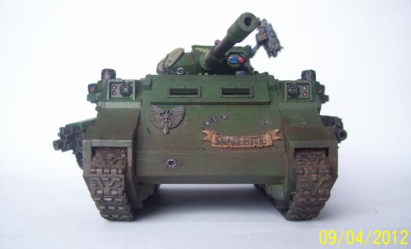 SNAKEBITE suffered many close shaves, particularly from high-velocity armour-penetrating rounds, fired from Chaos autocannons. However, not a single round was able to penetrate SNAKEBITE's armour, and she continued to purge the enemies of the Imperium. Crewed by battle brothers Demitrik and Kia, SNAKEBITE was a thorn in the side of the Chaos force, particularly in her hit-and-run attacks on the enemy's elite Chaos Marines.