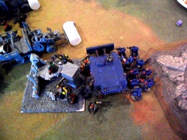 Neither the scouts or assault marines make it. He pulls the sternguard rhino alongside the middle objective to roast the orks while Pedro stays near the scouts.