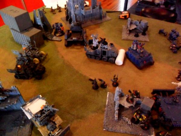 KFF BW towards Pedro and the Shoota BW towards the sternguard. The last trukk gets around the pile of wrecks and is behind the