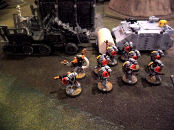 The Sternguard fire 4 melta shots at the Shoota BW with two in 1/2 range: Nothing big happens and it still stands. The Assault marines ruin the mob that was sitting on the objective formerly held by scouts. The Nob survives to run right along the