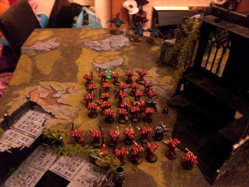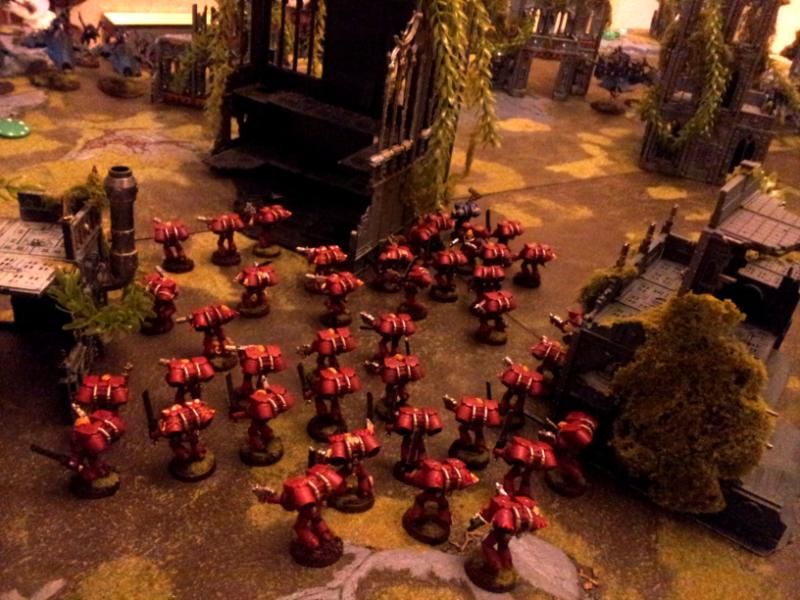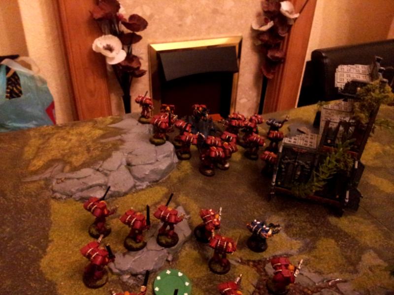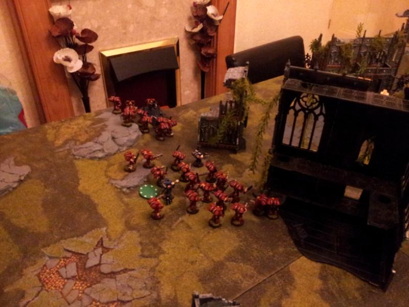 Blood Angels forth turn; I bounce the two Assault Marines from the melta combat squad over by the shrine ruin, the full strength flamer unit moves up by them to give feel no pain from the Priest and also act as a shield for the depleted flamer unit behind, they have the left flank objective.