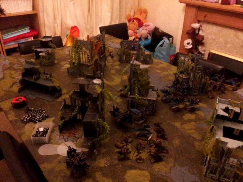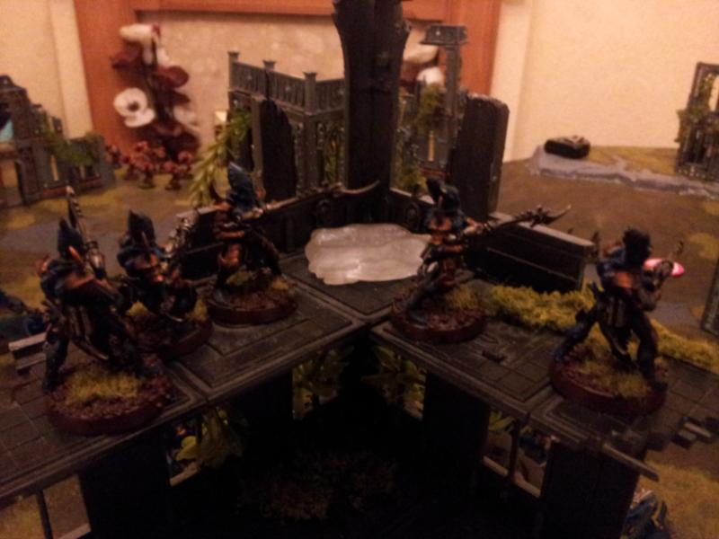 Assault; Beastmasters charge through terrain to get at the Scouts, the two Scouts attempt to fight the pack of dark kin beasts, though Razorwings and Khymerae rip them up. The large ruin objective now belongs to Dark Eldar.