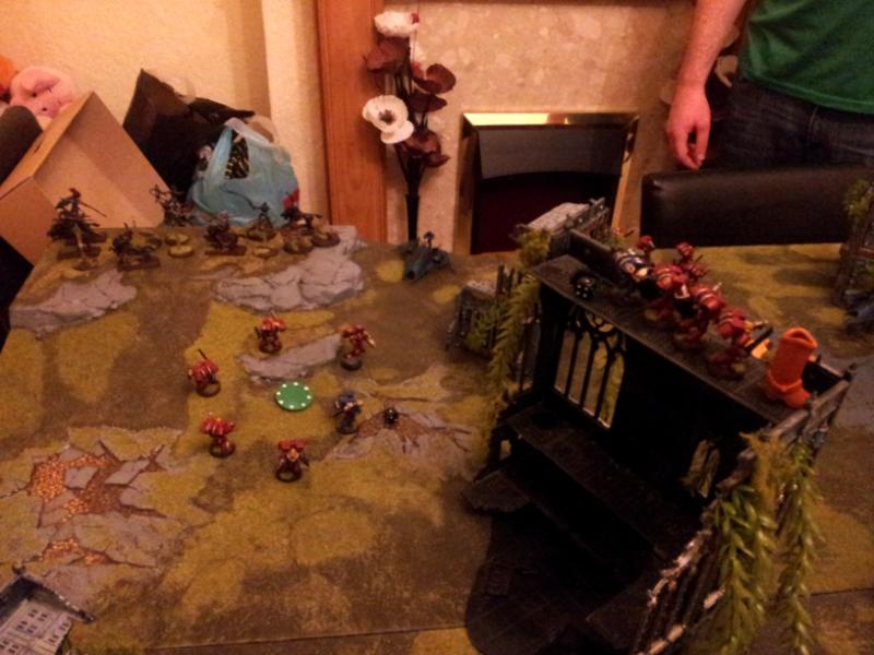 Next turn I hope I can bound forward next turn and make a better splash. I've got the combat melta squad and Honour Guard who both should be easily in range. Also, if Poddy does come out with Baron's Beastmasters I can counter assault with all my Assault Marines and use the consolidation move from combat to spring board my units closer to D.E forces.