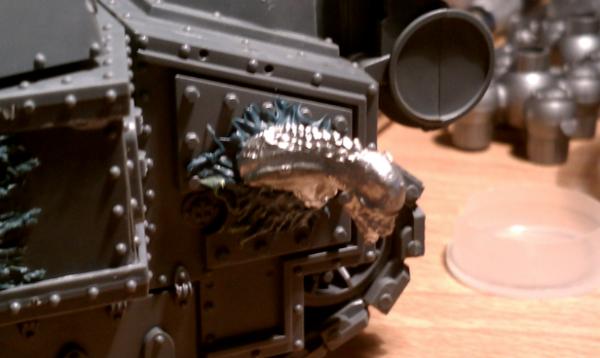 I can't think on anything in particular yet, but when painting it, whether it like the nine hells. Splatter washes and dirty things up. You could even add small amounts of gloss to give it a strange appearance, as though almost organic (in select places, otherwise it will just look like you spray painted gloss over the whole thing).. Also you could make small maggots (fine sized) to sprinkles across the tank, moreso in the flesh clumps. You can use rotting flesh and with a fine detail brush, paint small strokes to give impression of worms, if you rather not sculpt. Make sure they are small strokes.