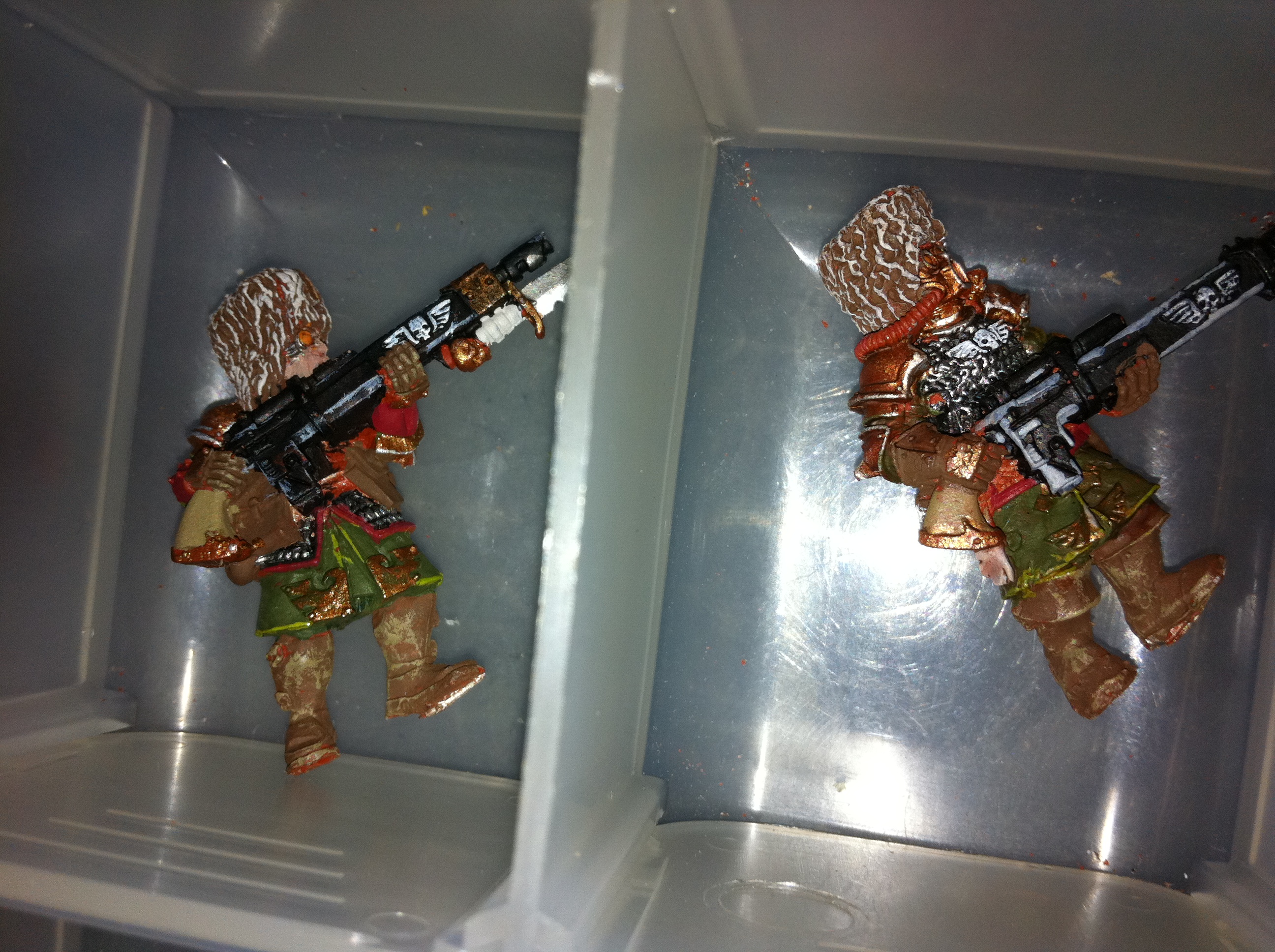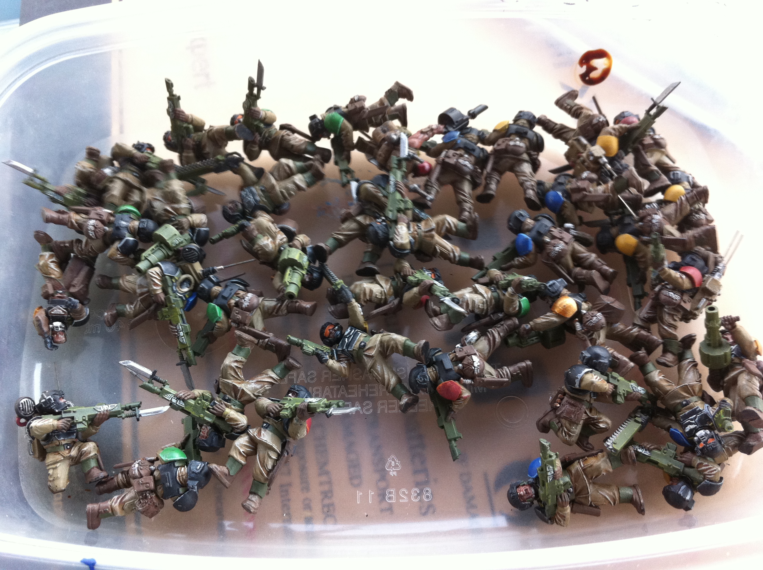 About 30 Vostroyans. Some fully painted. Some based Rust Red. Some bare metal. The Commander, Standard and medic are here from the command squad.