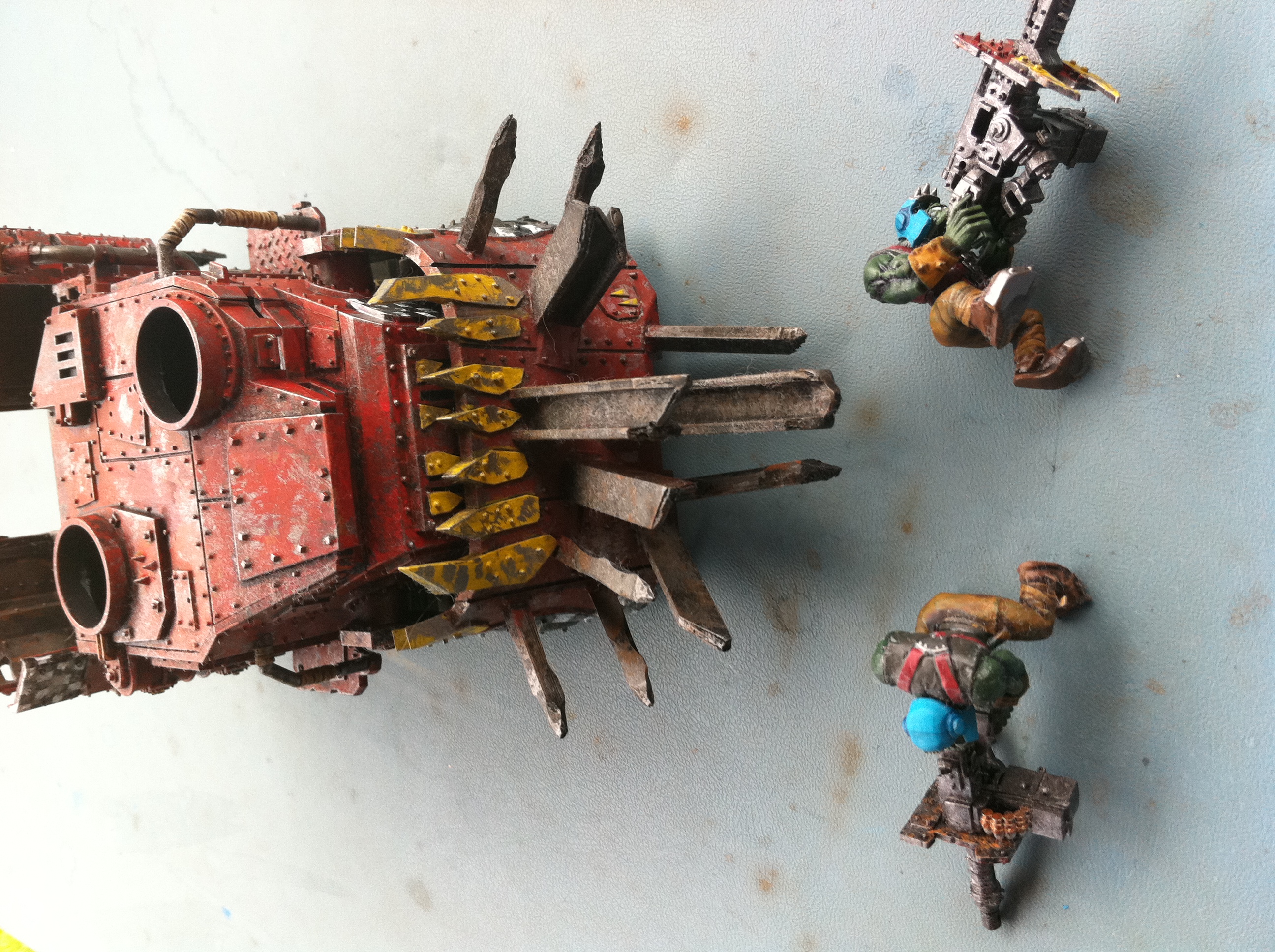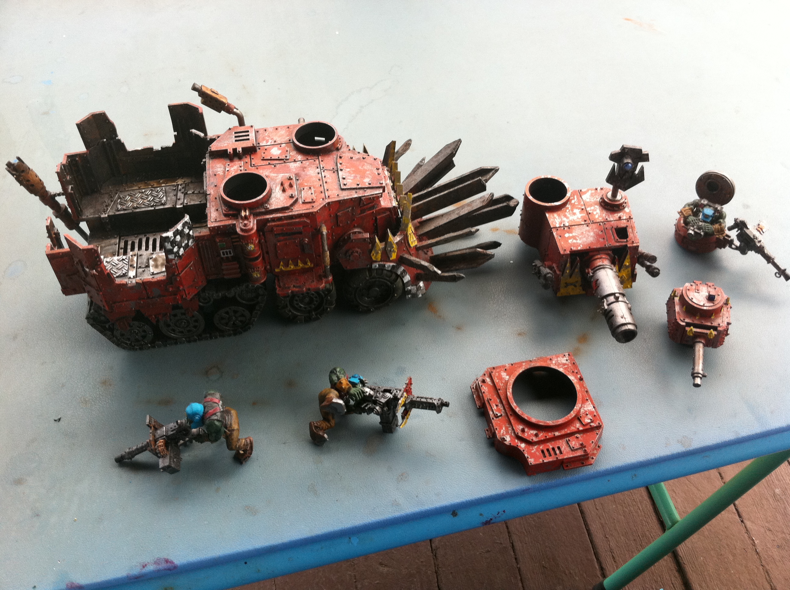 One Battlewagon complete. All turrets and gunners are NOT glued in. You can swap stuff around as you like. I have a custom ram plate that was made using sprue and "I" beams from Plastruct. I think it looks awesome!
