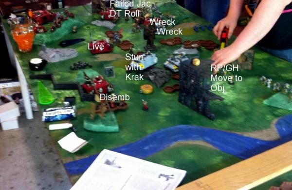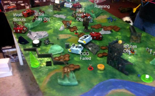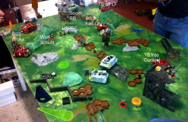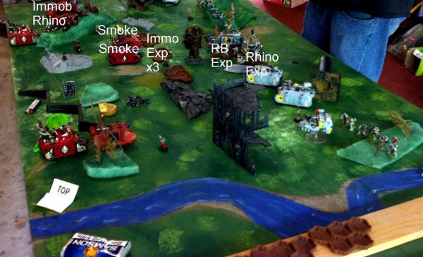 Yeah, on the deployment, I thought about some alternates, but was trying to maximize my cover from terrain. I probably should have deployed everything on the right flank and the parking lotted in front of his rhino wall, but was worried about getting overrun on one of my objectives.