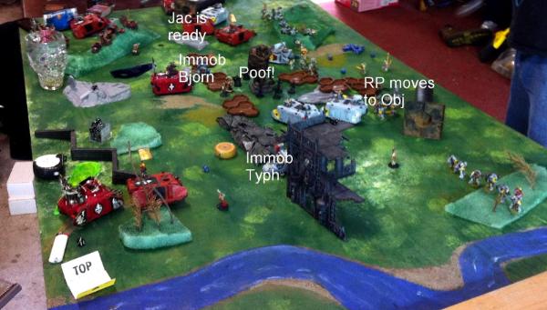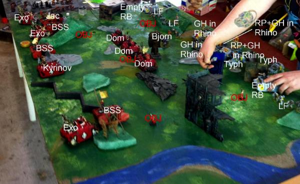 Jacobus hops in and moves forward (popping Smoke). BSS moves rapidly away from Bjorn towards objective. Kyrinov pops out and multis on a 5 Man GH and 7 Man + RP GH. They go poof. Shaken Exo goes and hides. Fearless regrouped Dominions (2 flamers left) get in Kyrinov's rhino.