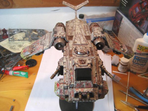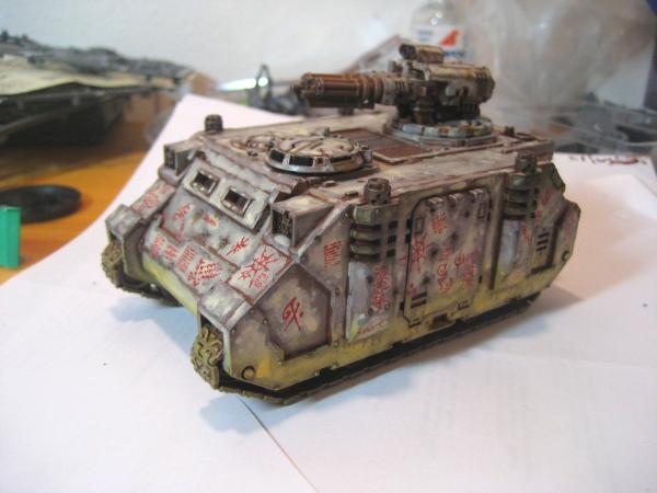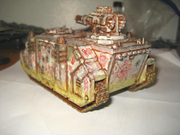 For the 'paint' on the vehicles, I essentially stippled thinned bone-colored paint (also vallejo, pretty close to GW's bleached bone), taking care not to hit any of the edges or crevices. A bit of rust streaks here and there with sepia wash on the bolts and battle-damage and I called it good.