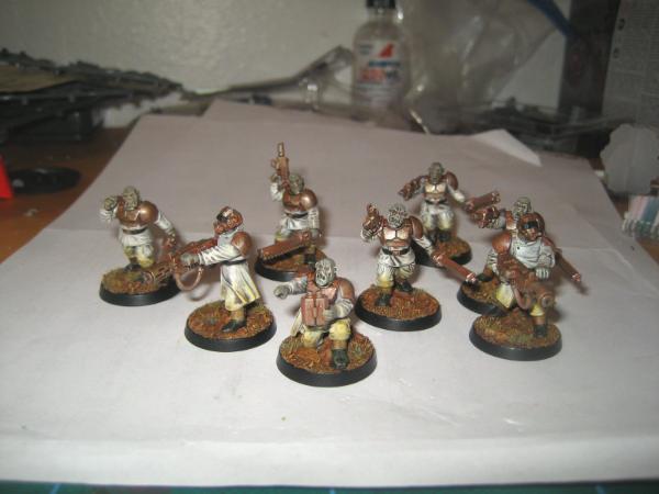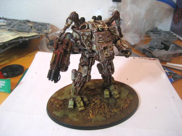 My rust method is pretty straightforward: the basecoat was a dark brown (espresso, maybe?) krylon spray, followed by a heavy wash of an orangey-brown vallejo paint (the label has rubbed off, unfortunately, but it's pretty close to the old GW vermin fur), finished with some random scrapes of P3 pig iron. If the mood strikes, I'll hit some additional highs & lows with either thinned blazing orange or brown/sepia wash.